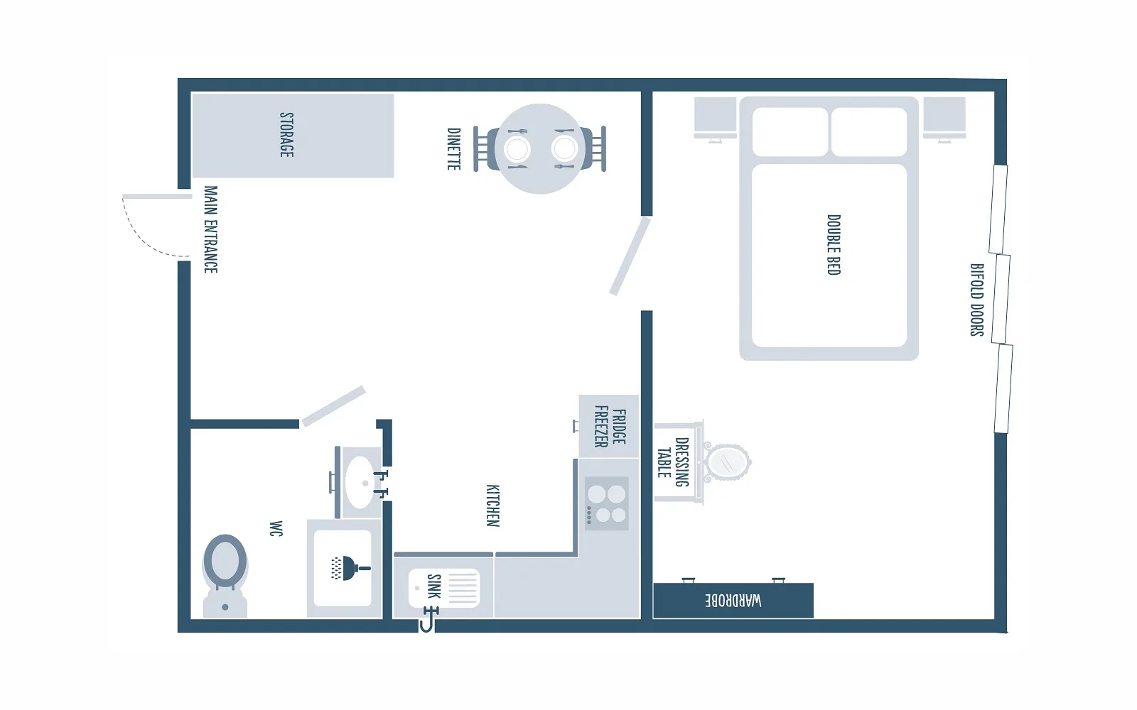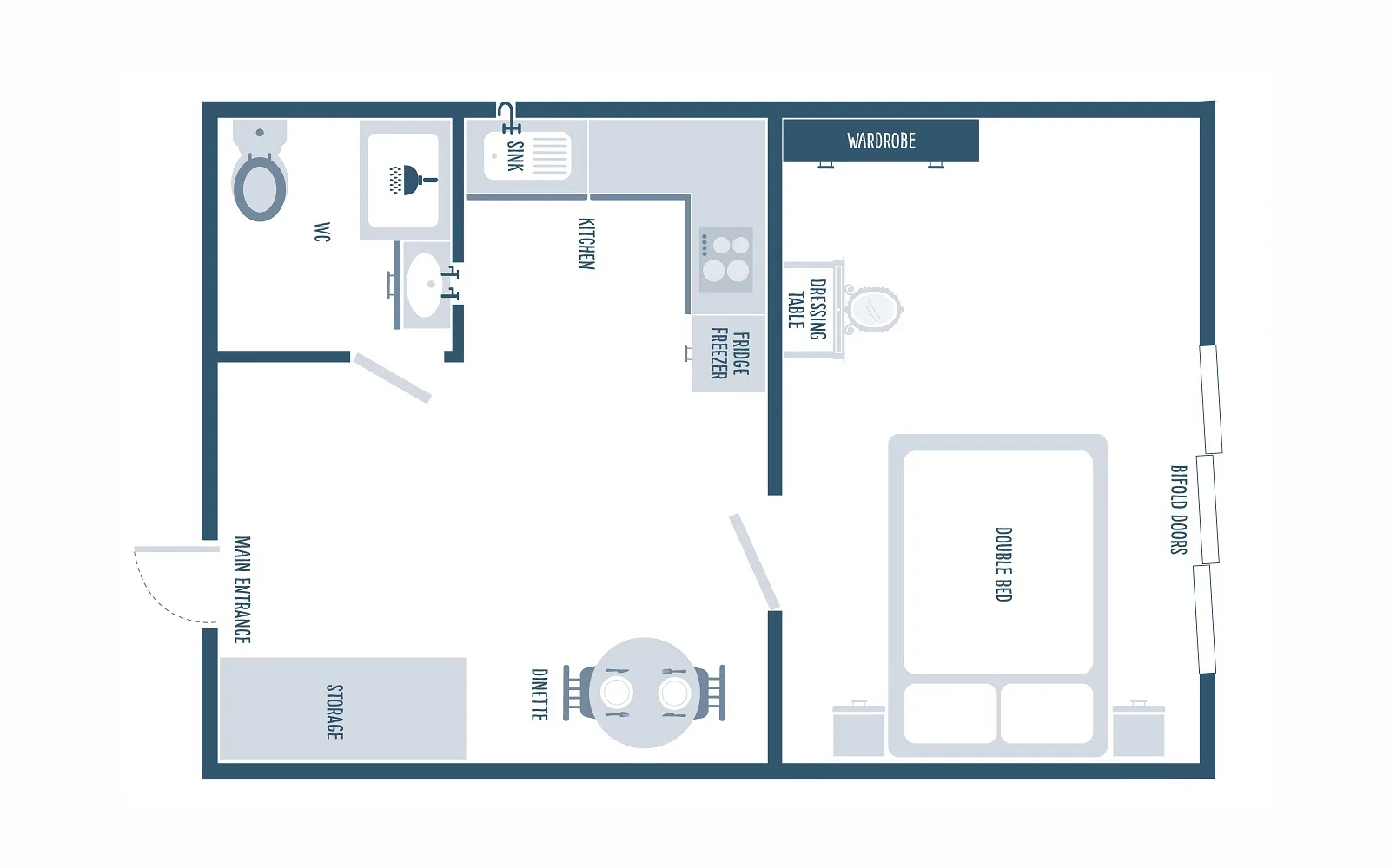 • Kitchen – Oven, hob, microwave, toaster, fridge/freezer and a dining table and chairs for two