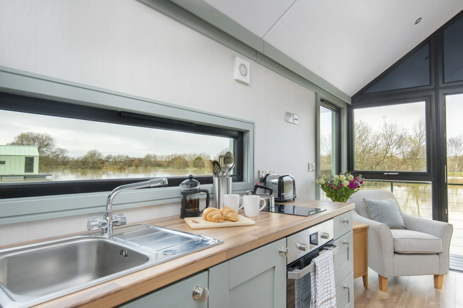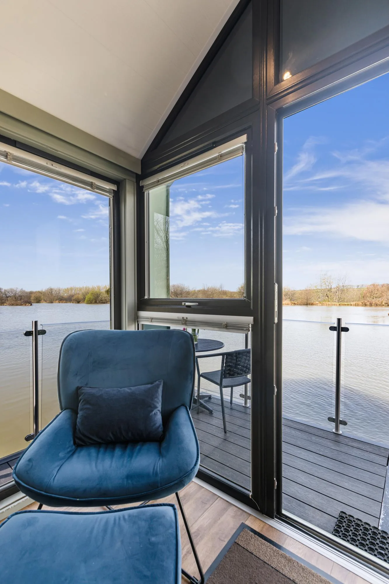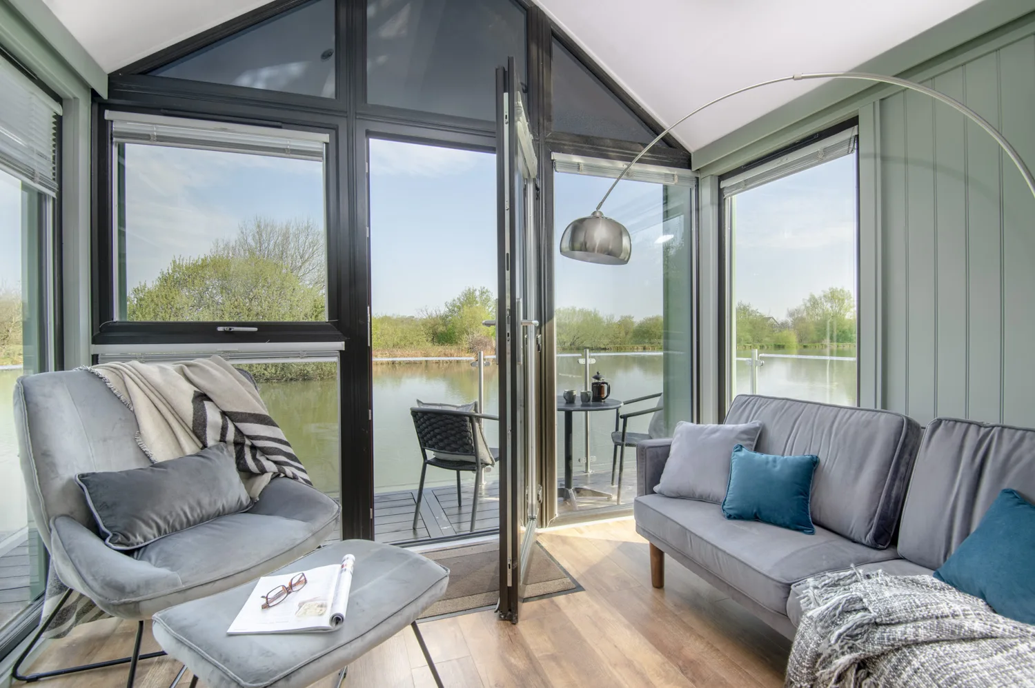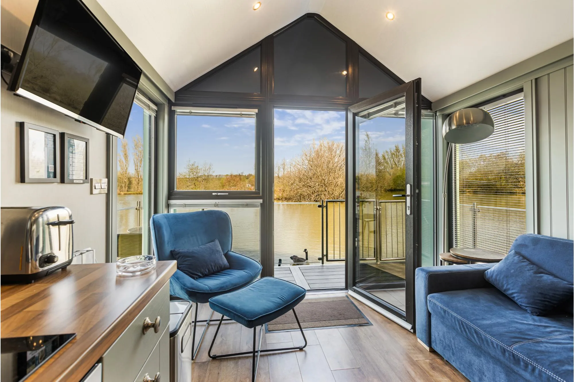 Our Floating Lodges, which are a modest size, can sleep two adults and two small children (up to age 10) with one double bed and a sofa bed (small double 4′ wide) in the lounge area. Additional amenities include a well-fitted kitchen, Smart TV, bathroom with a walk-in shower and convenient parking nearby.