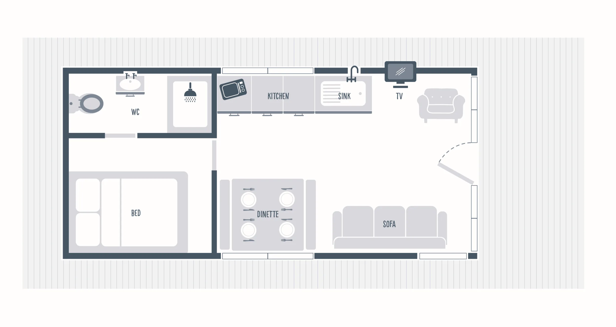 The kitchen, dining and living area are all fully open plan. The bathroom is accessed via the bedroom area.