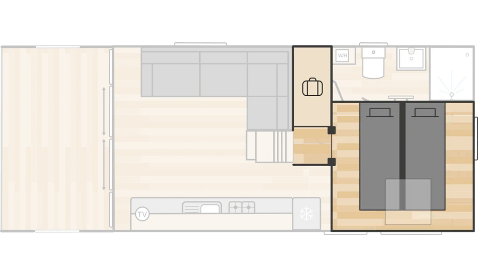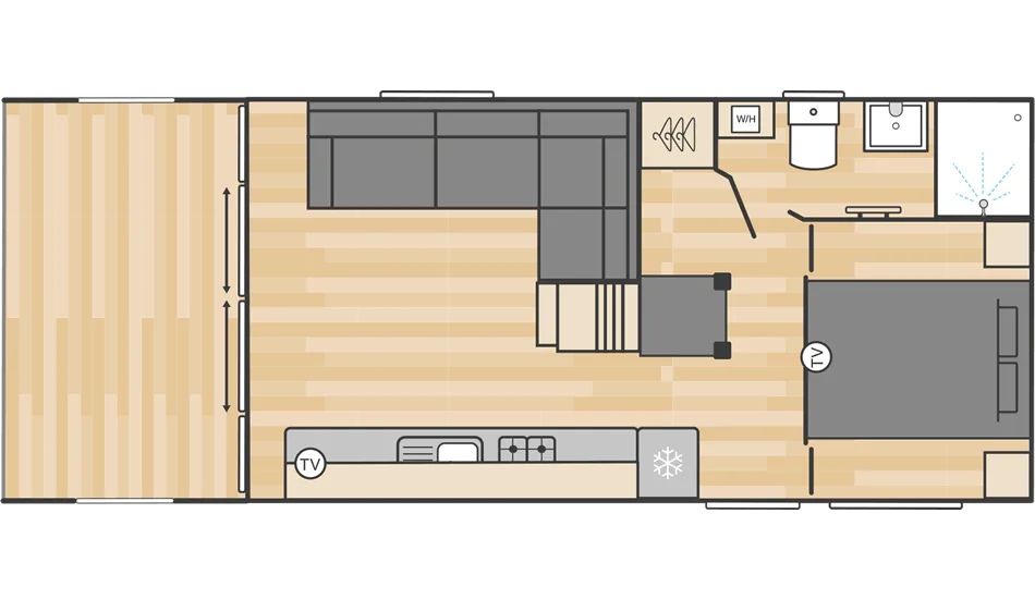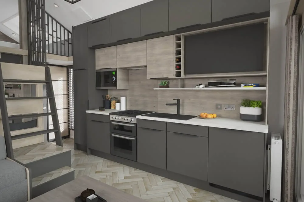 Step inside and you’ll find a beautifully designed interior with a Smart TV, a king bedroom and shower room on the ground floor, while the mezzanine level provides a cosy twin room with two 2ft6 beds an exciting hideaway for younger guests with limited head room. A sofa bed in the lounge sleeping an additional guest if need be, means there’s room for the family to relax and unwind.