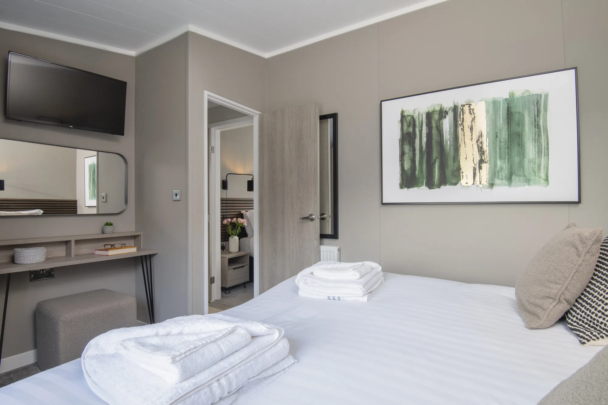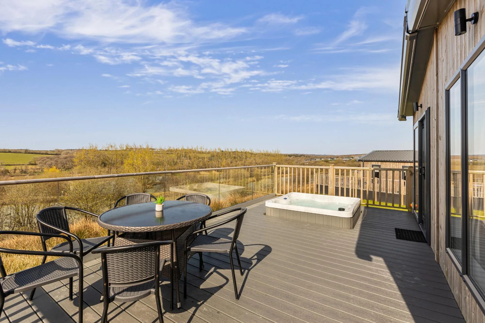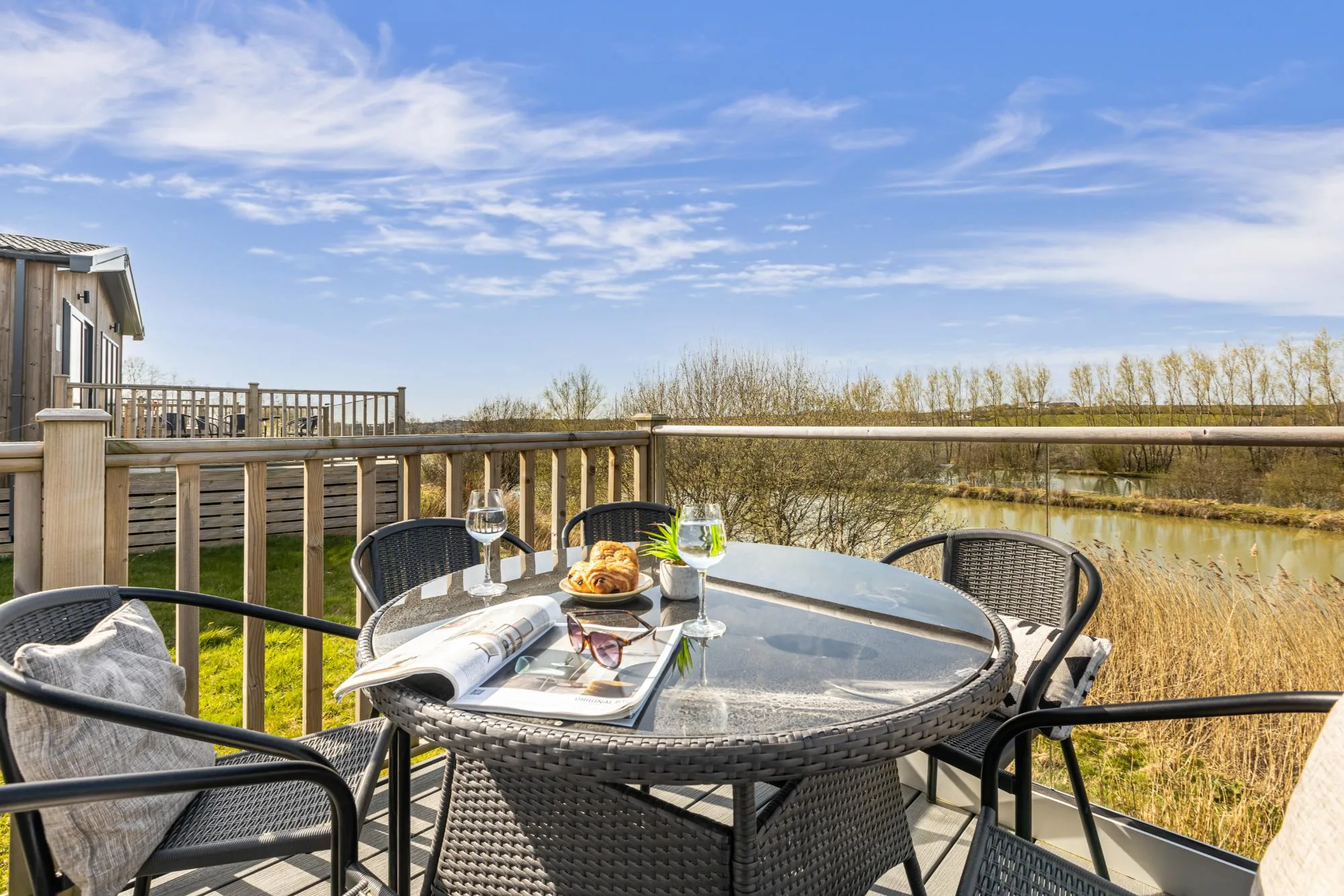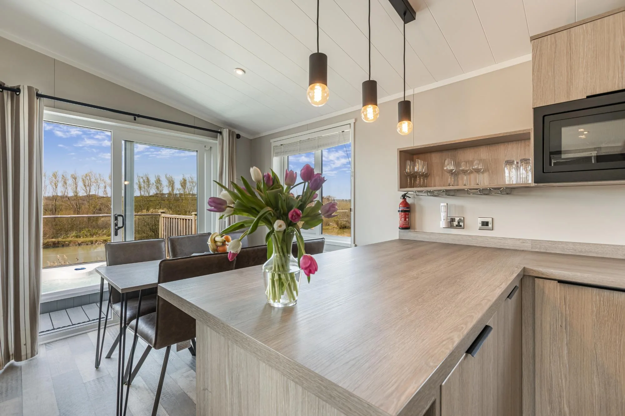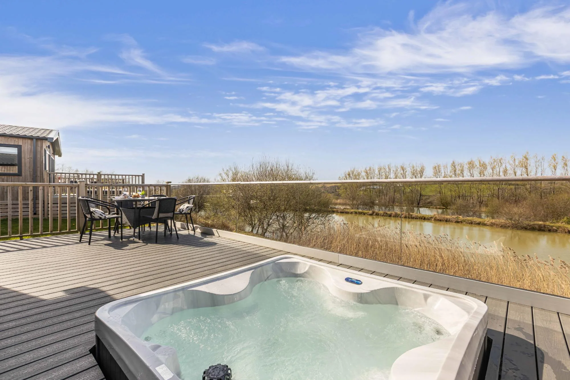 The Meadow Deluxe pet-friendly Lodges are modern, spacious and luxurious. The open plan kitchen, dining and living area lends itself perfectly to family living. These lodges are set back from the edge of the lake but you can enjoy uninterrupted views across the lake from the large decking which is also complete with outdoor furniture and private hot tub – the perfect spot to enjoy the peaceful surroundings of the resort.