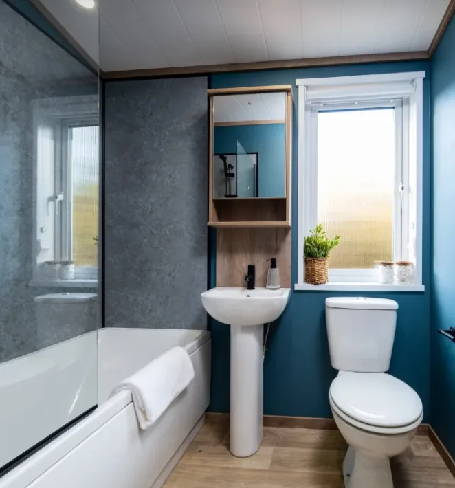 Inside, you’ll find a spacious open plan living and dining area in the centre of the lodge with a fully equipped kitchen, designed for relaxed meals and sociable moments together. Both bedrooms feature comfortable king size beds each with a TV and an en-suite shower, the main bathroom also boasts a bath, and with floor-to-ceiling windows and patio doors leading directly onto the deck, every room makes the most of those unforgettable views.