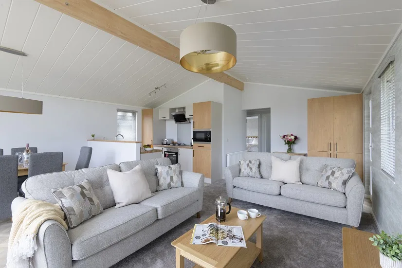 This unique centre lounge model features a spacious lounge area and decking with two bedrooms on opposite sides of the lodge