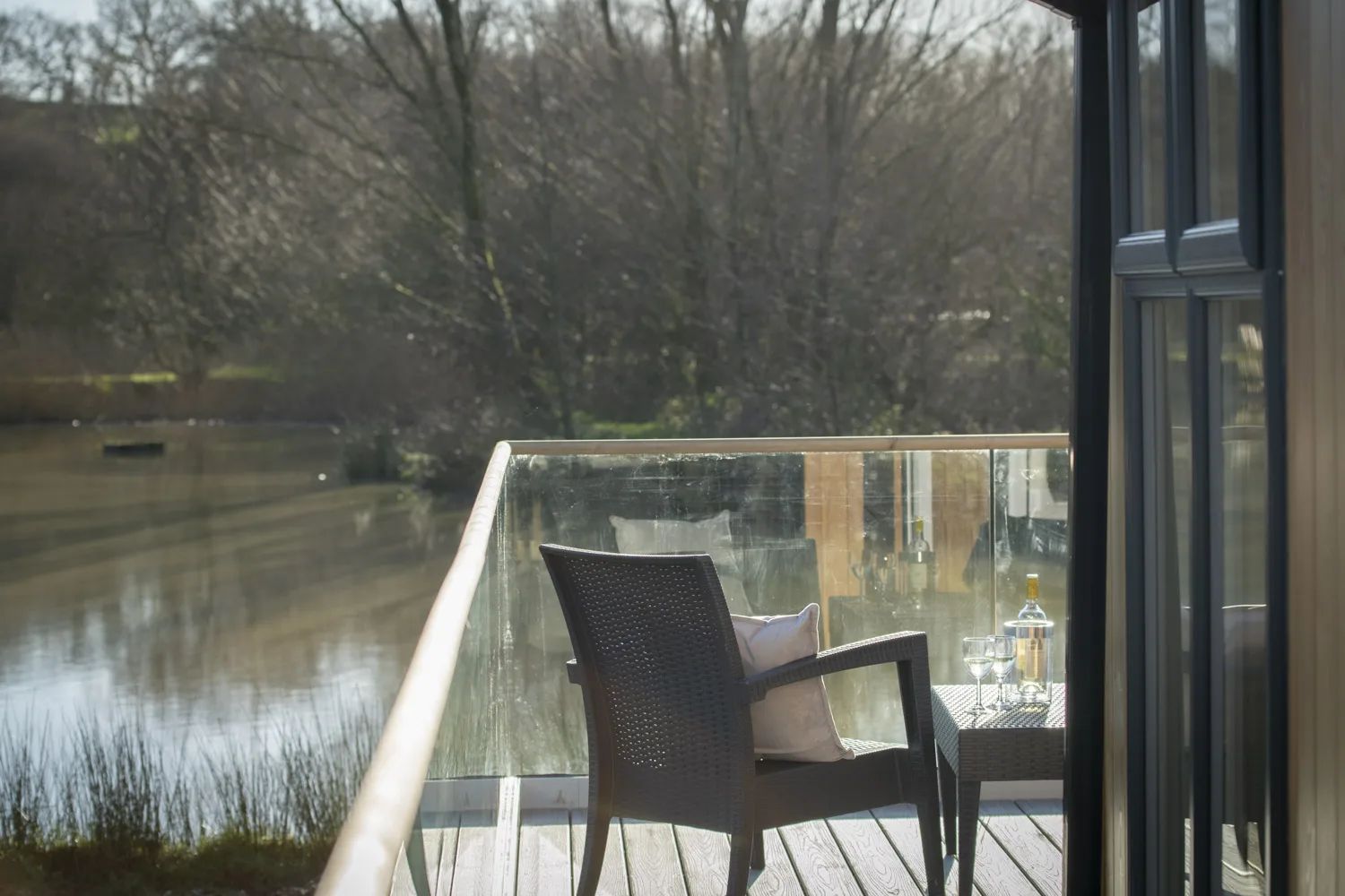 Our Deluxe Lakes-Edge Lodge offers uninterrupted views over stunning fishing lakes, whether you’re soaking in the hot tub, sipping champagne on the private deck, or relaxing in the lounge with panoramic scenes framed by floor-to-ceiling glass doors. Every detail of the interior exudes elegance, providing a perfect balance of modern sophistication and cosy warmth for all to enjoy.