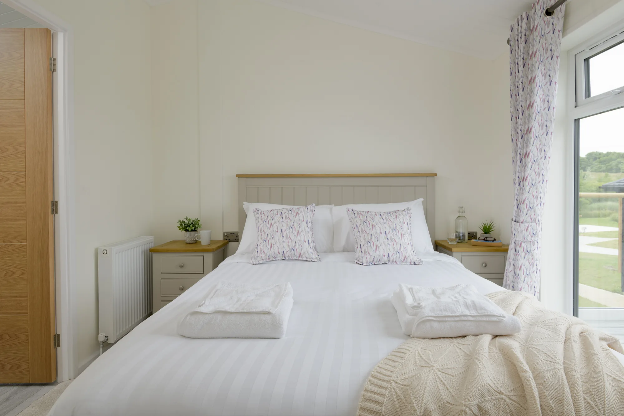 This unique centre lounge model features a spacious lounge area and decking with two bedrooms on opposite sides of the lodge. This new layout maximises the space you get on the decking, which includes outdoor furniture and a hot tub.