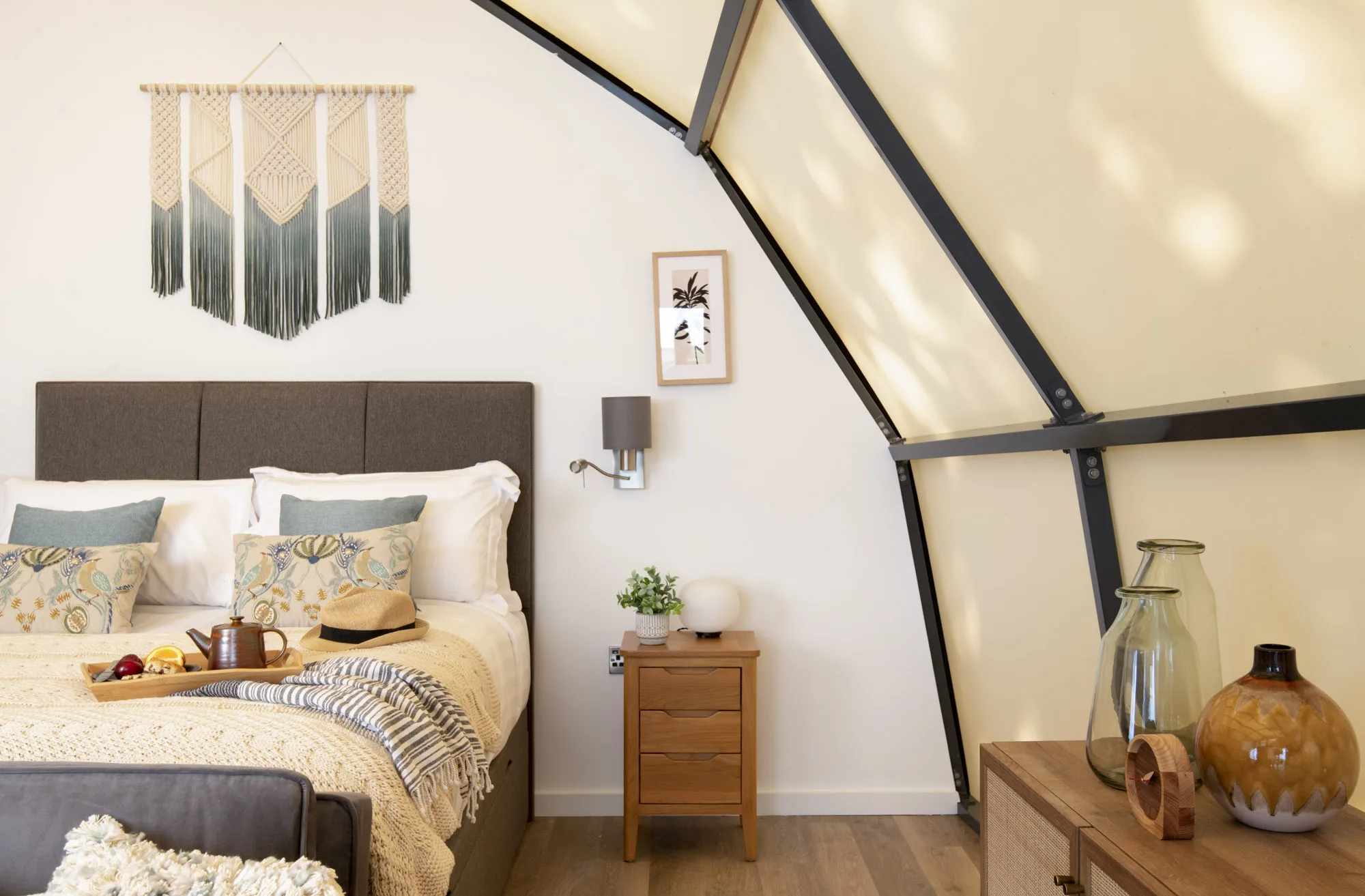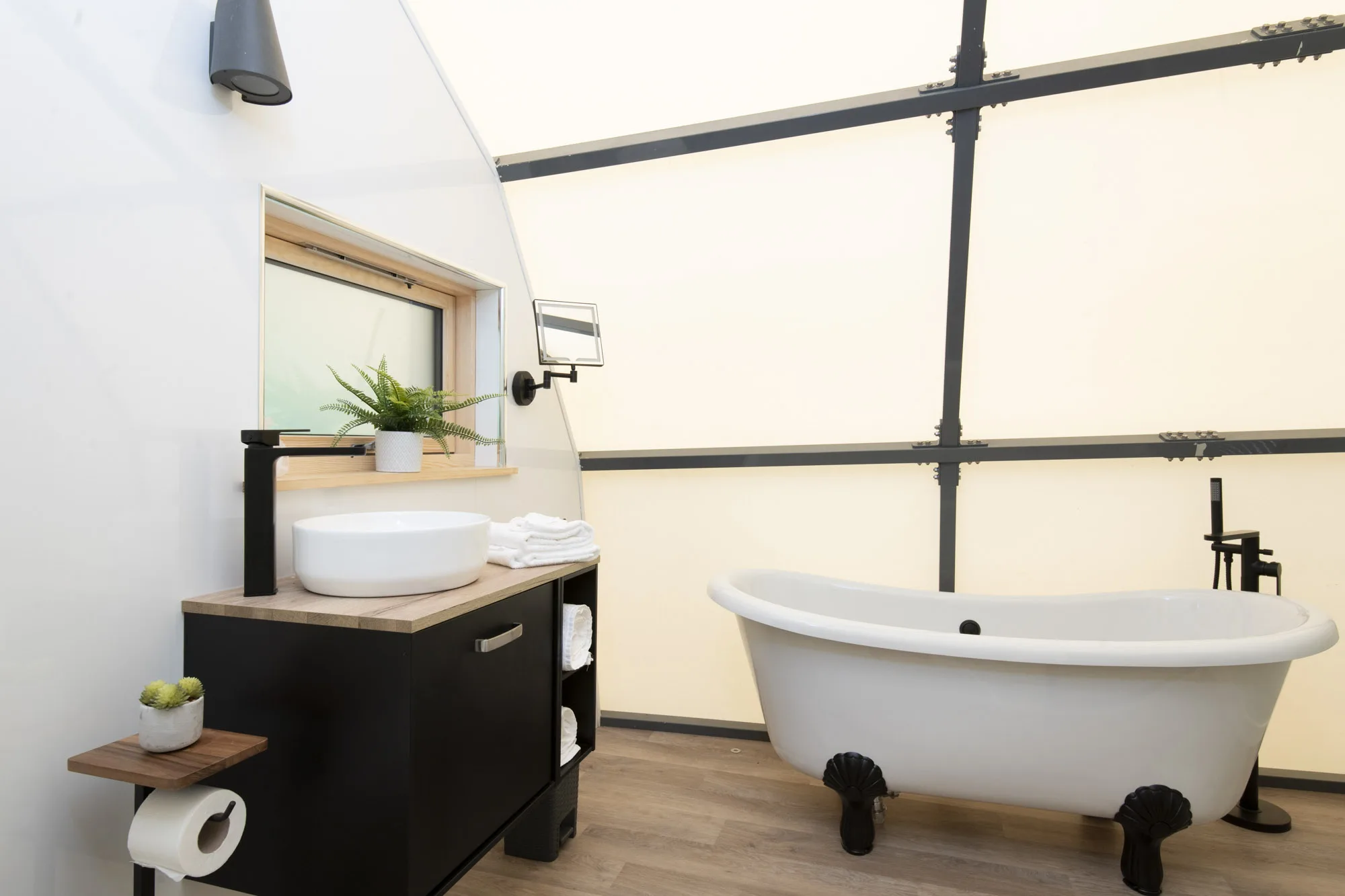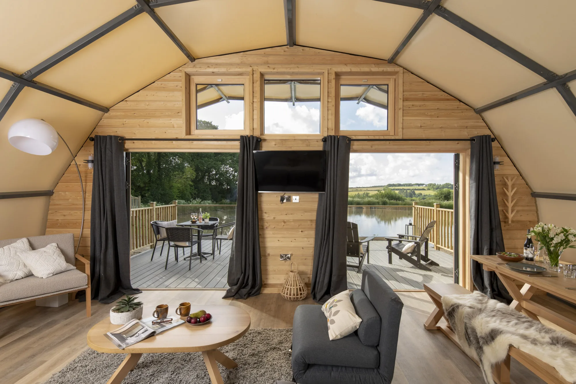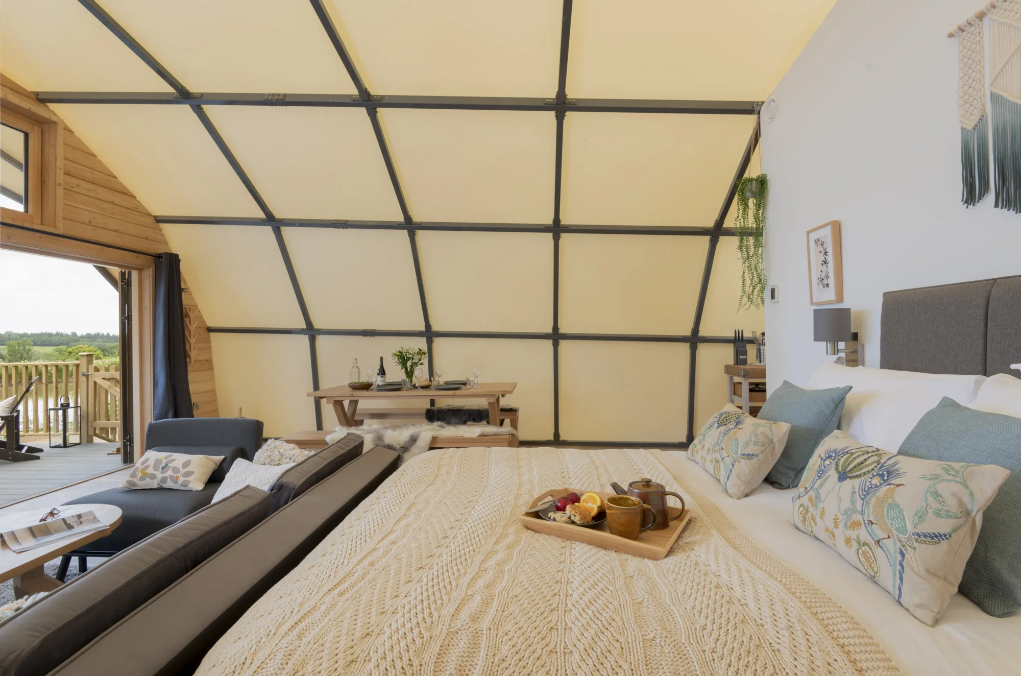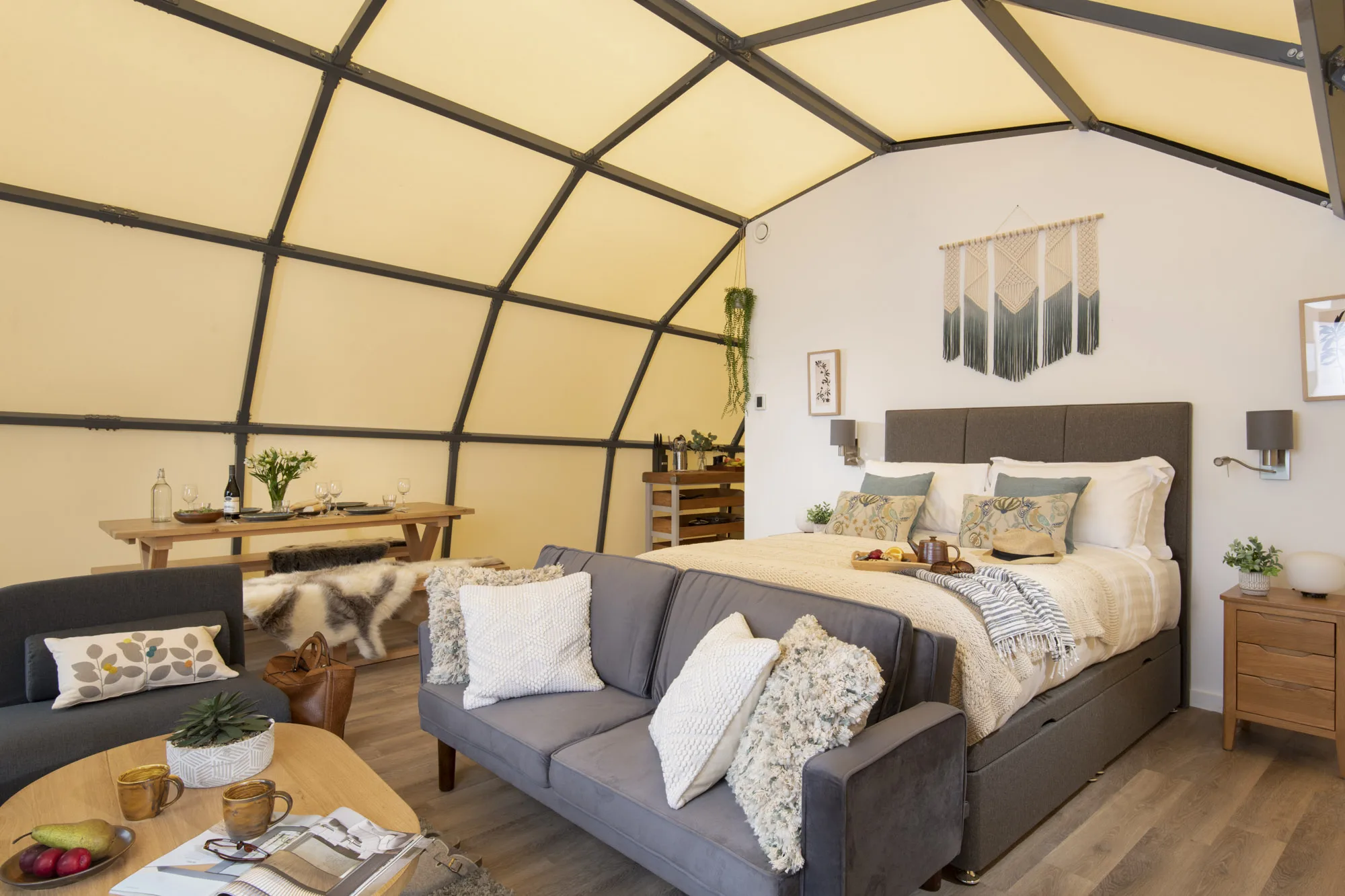 This is no ordinary accommodation for no ordinary holiday. With a striking steel structure, a distinctive canvas profile and a stunning expanse of glass, you’ll live in complete comfort whilst welcoming the natural world right into your home. Sleeping up to five people, this is no pokey living space. Your Cocoon rises from comfortable head height to 4 metres tall, with all the luxury and facilities you need at your fingertips, including our trademark high quality finishes including a roll top bath, luxurious furnishings and bedding. Ideal for those seeking a blend of outdoor adventure and comfort, the Cocoons aren’t insulated however there’s cosy beds and hot & cold air conditioning too so you’ll be comfortable whatever the season.