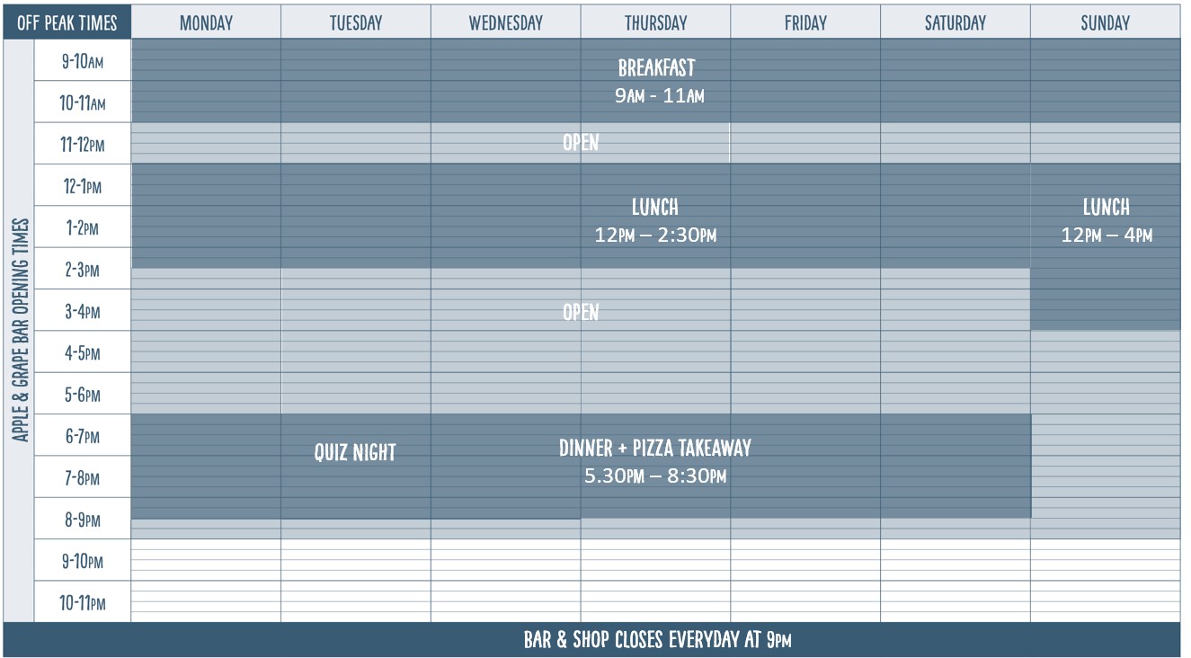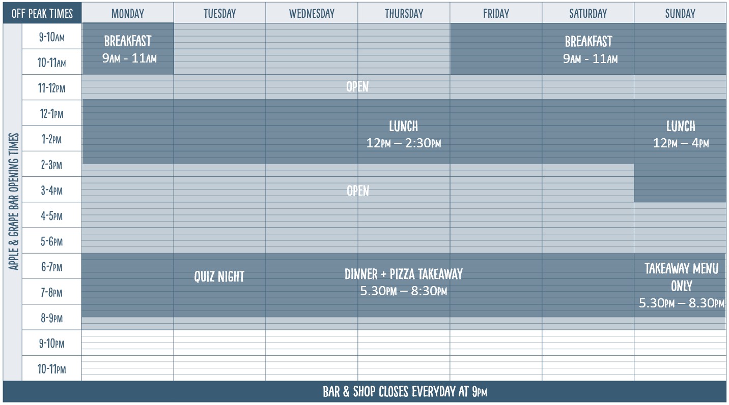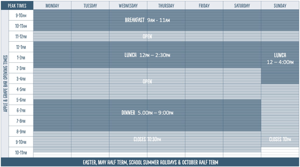 October Half Term – Please refer to our special board outside the Apple and Grape for opening times