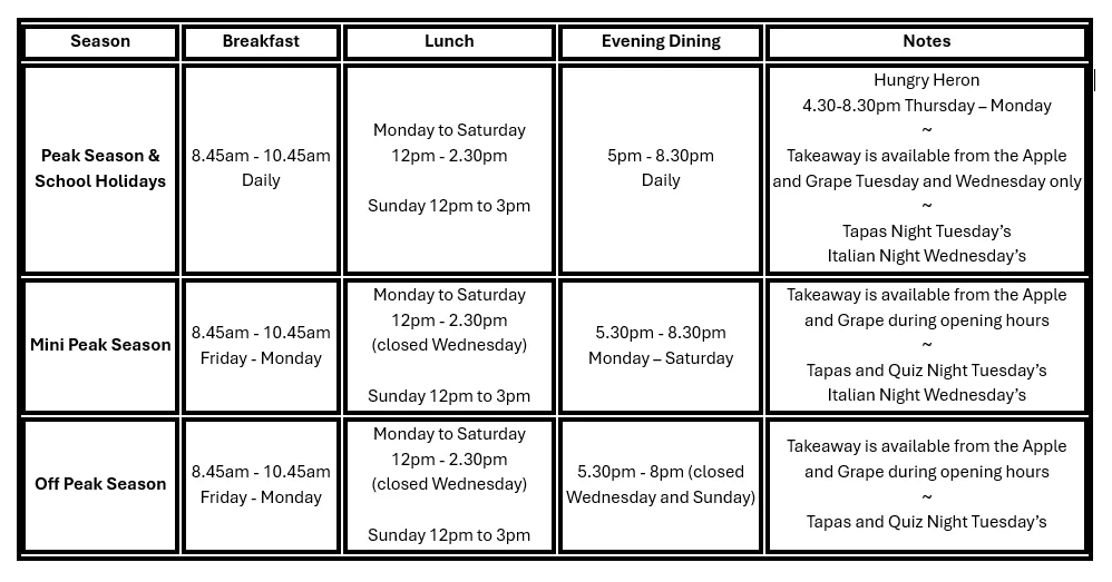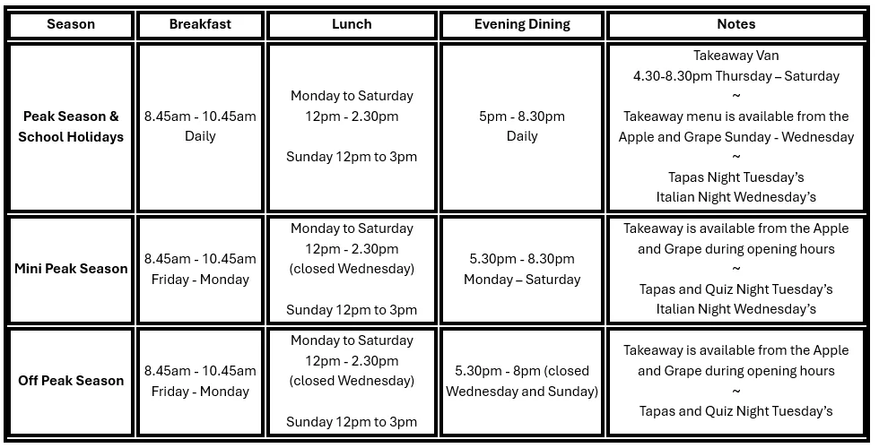 Exact weekly opening times and menus will always be confirmed on resort and displayed outside the Apple and Grape.